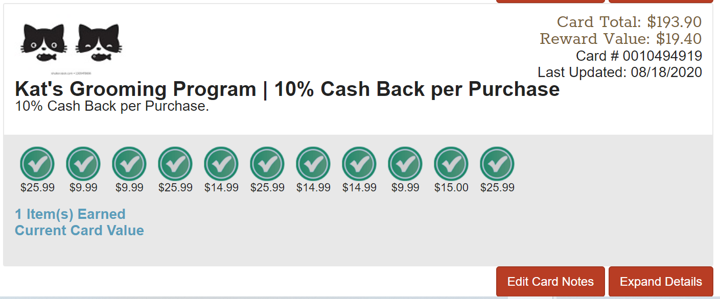 Just in case you are curious, here is what my demo card looks like when it is completed. We see that this customer has spent $193.90 with us and they have earned a 10% Cash Back Reward of $19.40.