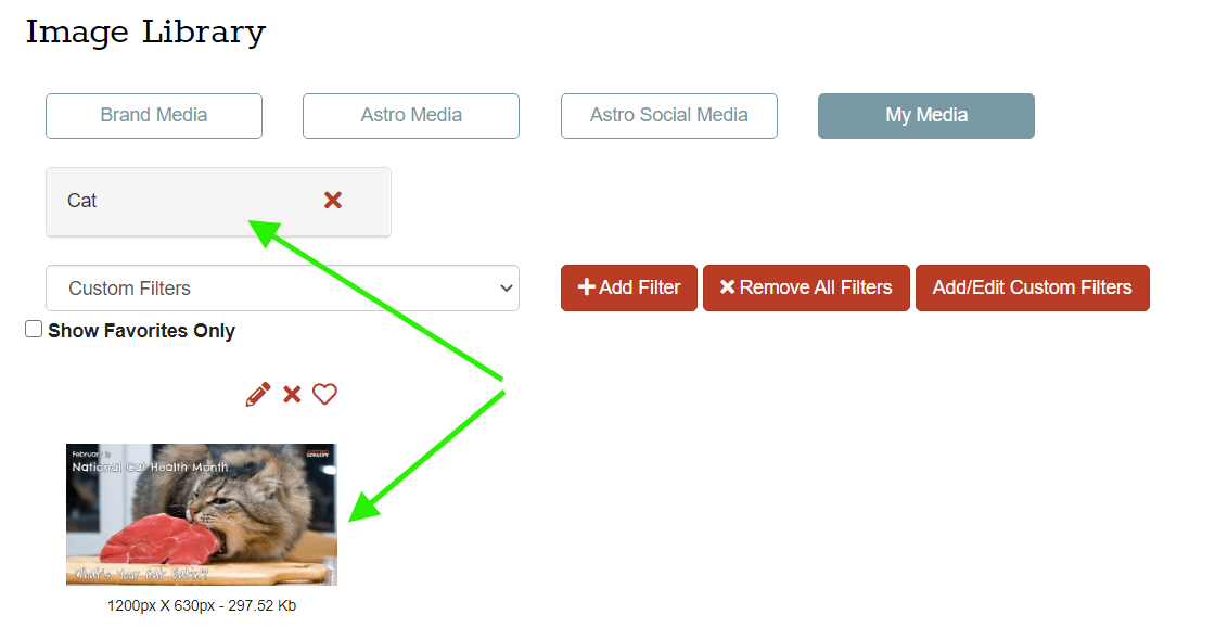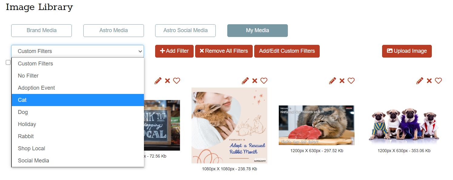 This is the coolest feature of the My Media folder! With this tool, you have the ability to create and use Custom Filters which will help you organize your images so they can be found quickly while creating campaigns.