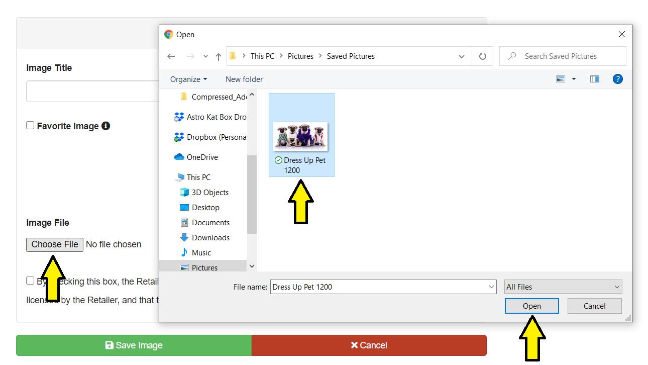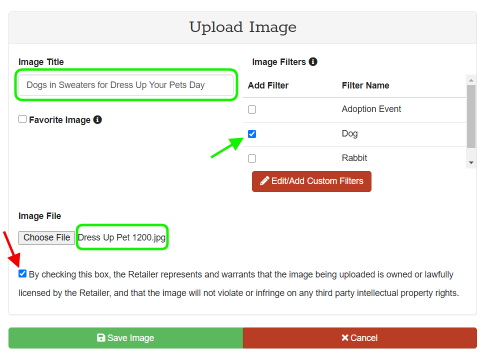 Continue filling in the rest of the image details: Image Title, Image Filter/s, Favorite Image (optional), and check the box beside the statement saying that the image belongs to you. When finished click Save Image.