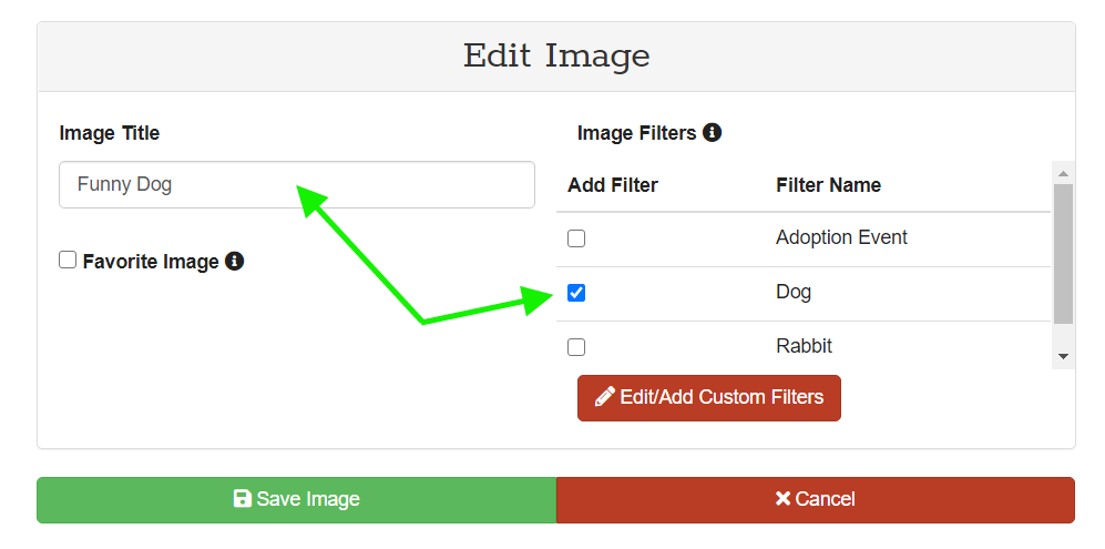 From here you can add/edit an Image Title and assign an Image Filter (or multiple Image Filters if applicable). You also have the option to Favorite the image, doing so will cause the image to appear at the top of your My Media page. When finished click Save Image.