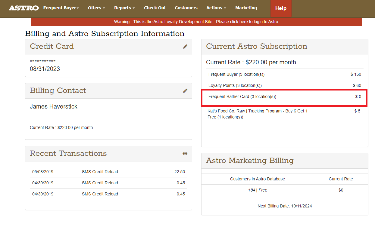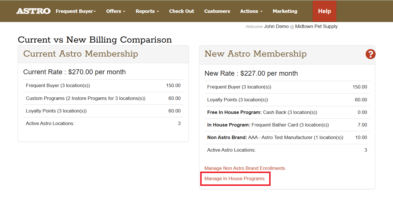 You will see the charges for any In-House Custom program that your store(s) is enrolled in under Current Astro Subscription section. They will be listed by Title of the program.