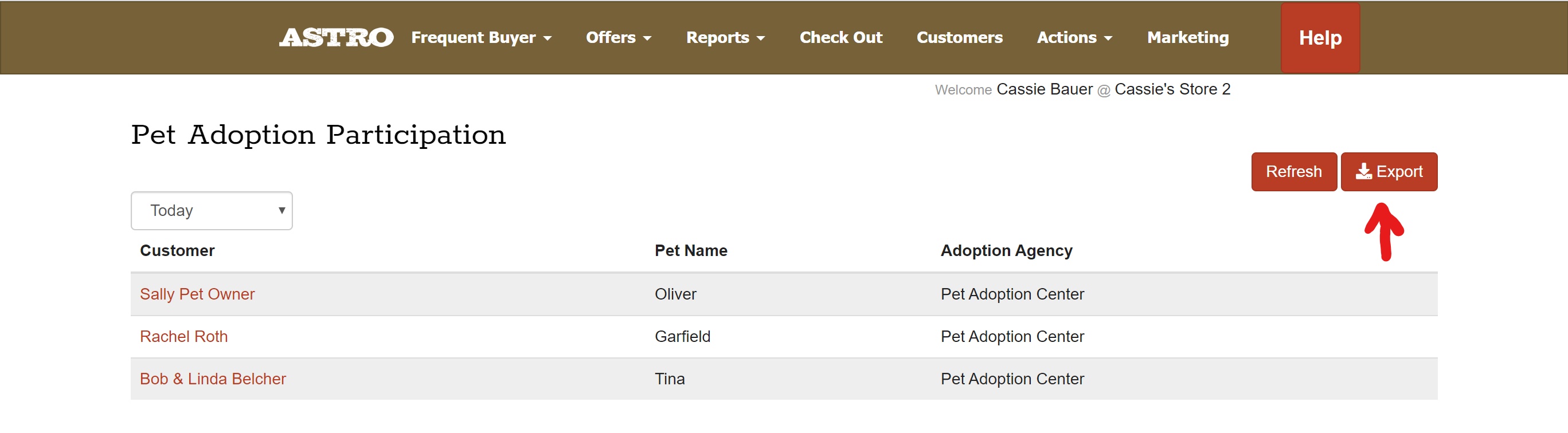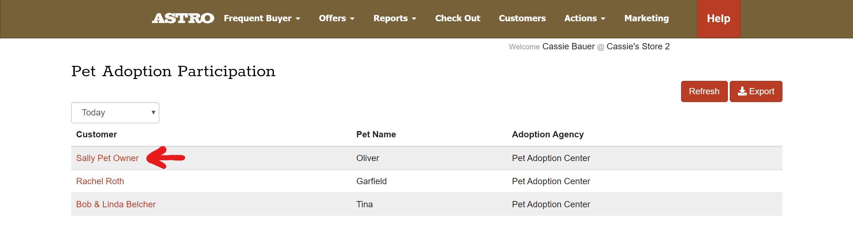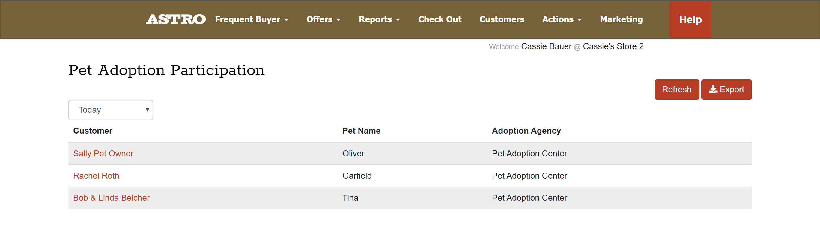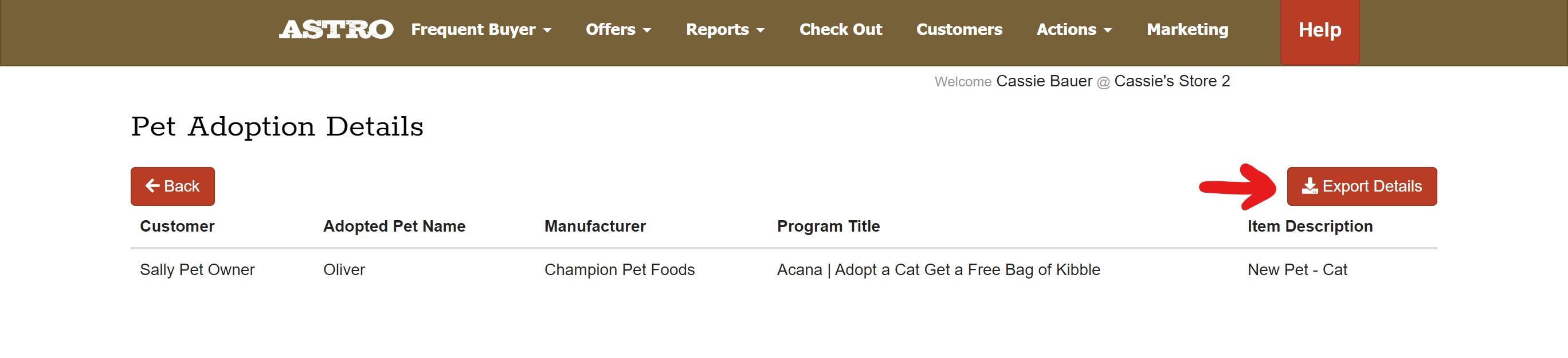 This will show you the Customer's Name, Pet's Name, Manufacturer, Program Title, and the Pet type. You can also export this customer's adoption details.