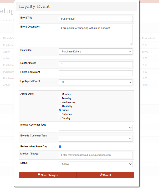 4. Enter in your Event details and you should see a section for the days of the week. Choose the day(s) you want your customers to be able to earn points.