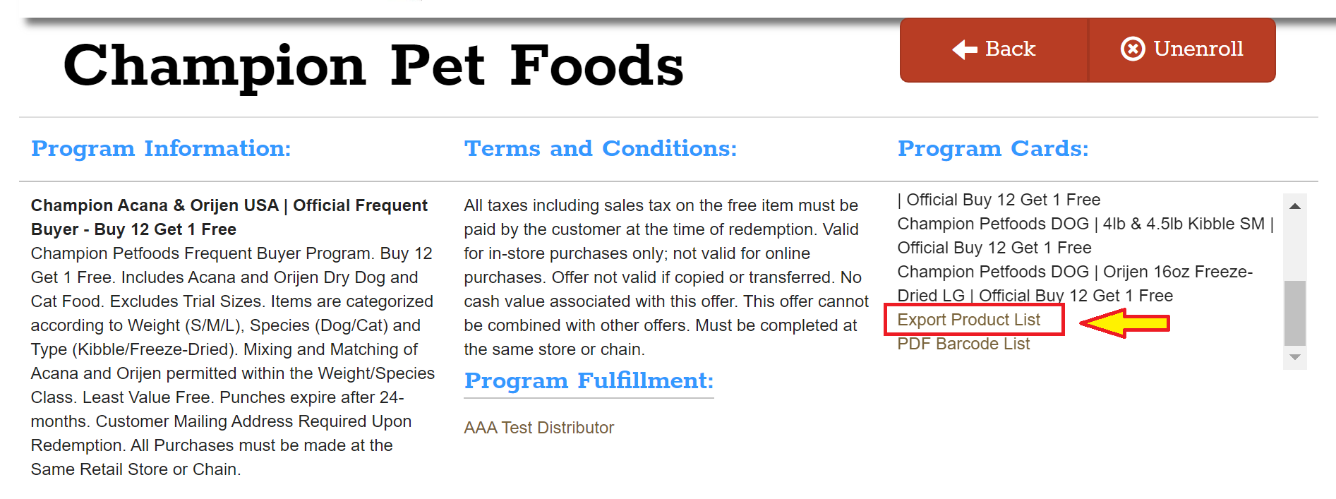 There is an Export Product List link below the list of Program Cards on all Frequent Buyer Programs.