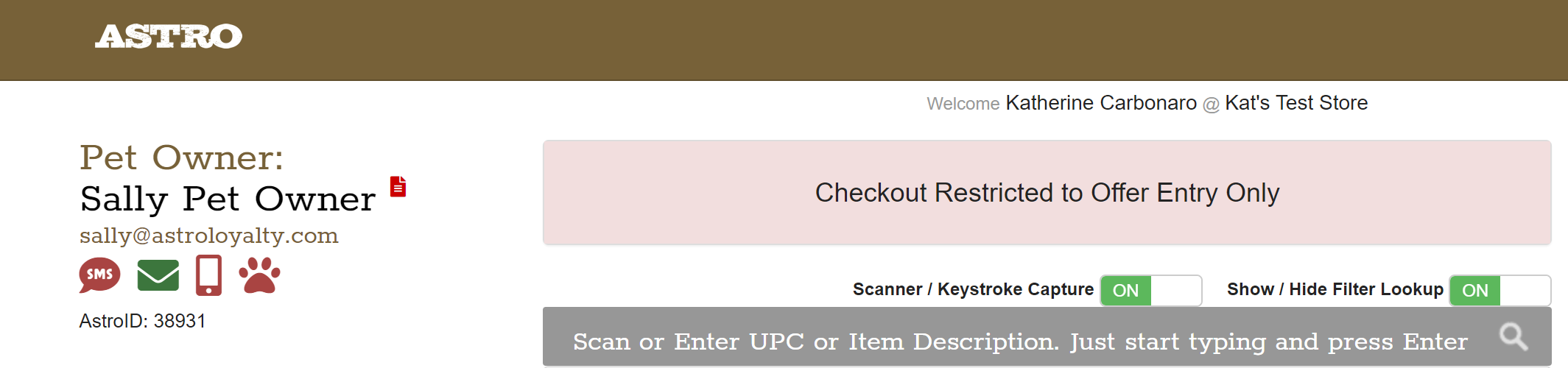 When you login to Astro and then go to Checkout to lookup a customer you will notice at the top of the customer's checkout screen that it says Checkout Restricted to Offers Entry Only. This is to help protect the integrity of your Pet Rewards Plus Frequent Buyer Programs since Astro will not allow you to add a random purchase to a Frequent Buyer card.