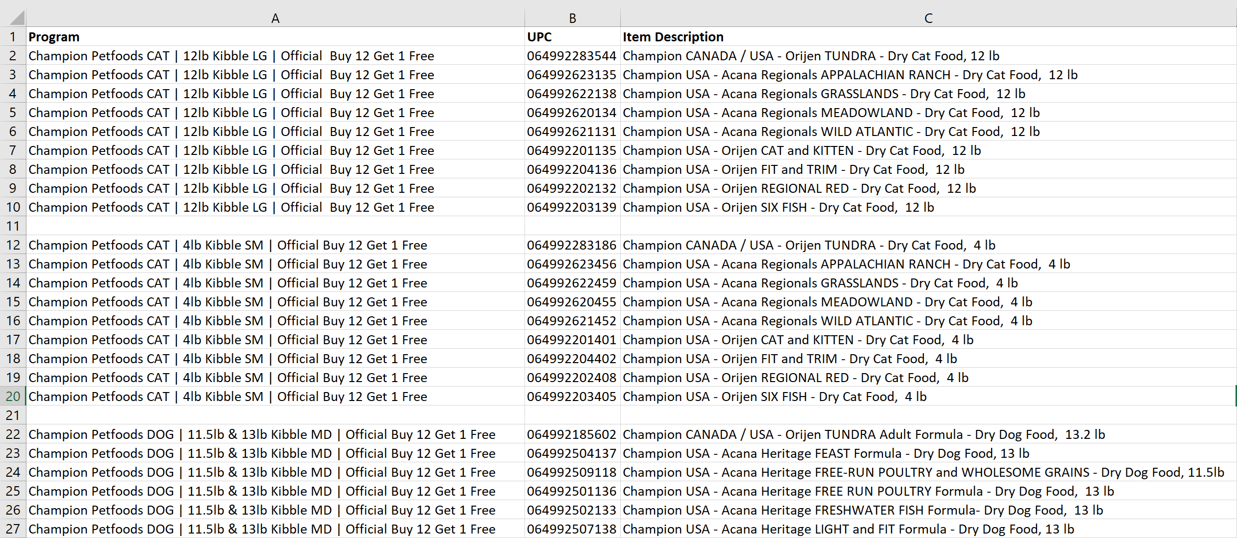 This will generate a spreadsheet that shows you exactly what items are permitted on each program card within the master program. This can be very helpful if you are not sure how to group items within your cloned program in Pet Rewards Plus.