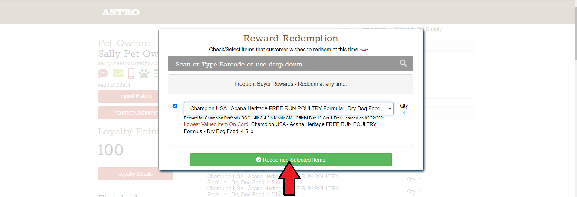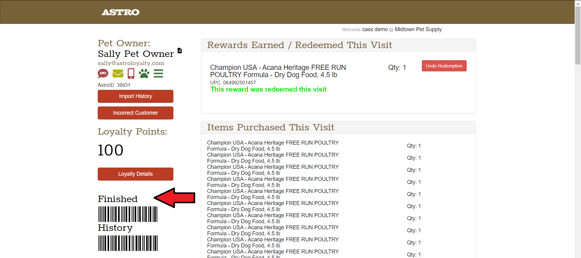 2. In Astro, it will show if the customer has earned a reward under Unredeemed Rewards.