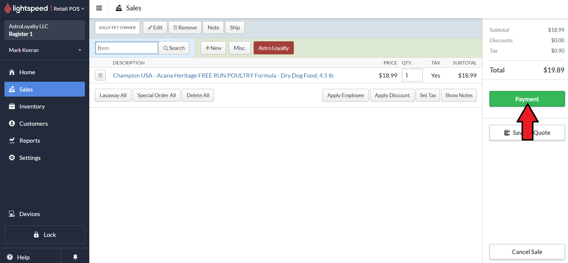 1. Add the customer's sale to Lightspeed and select the Astro button.