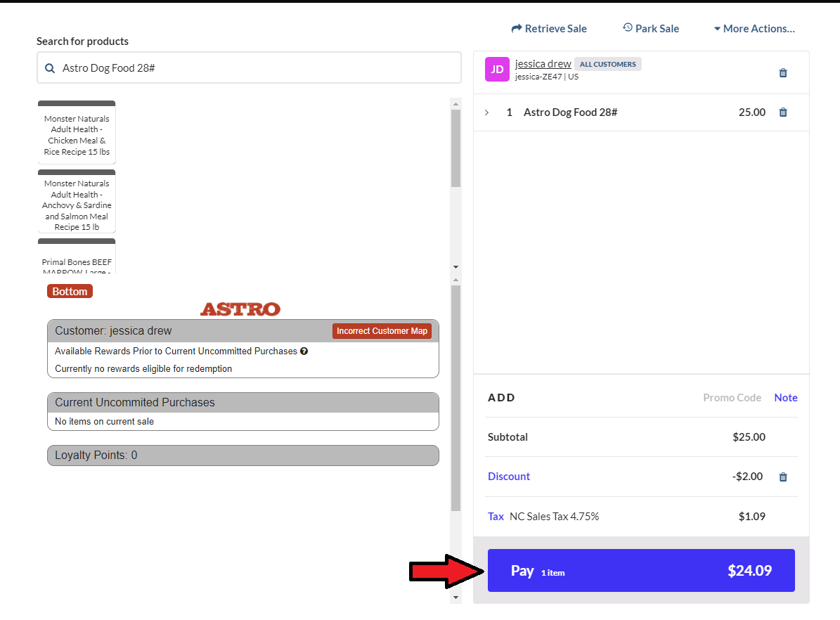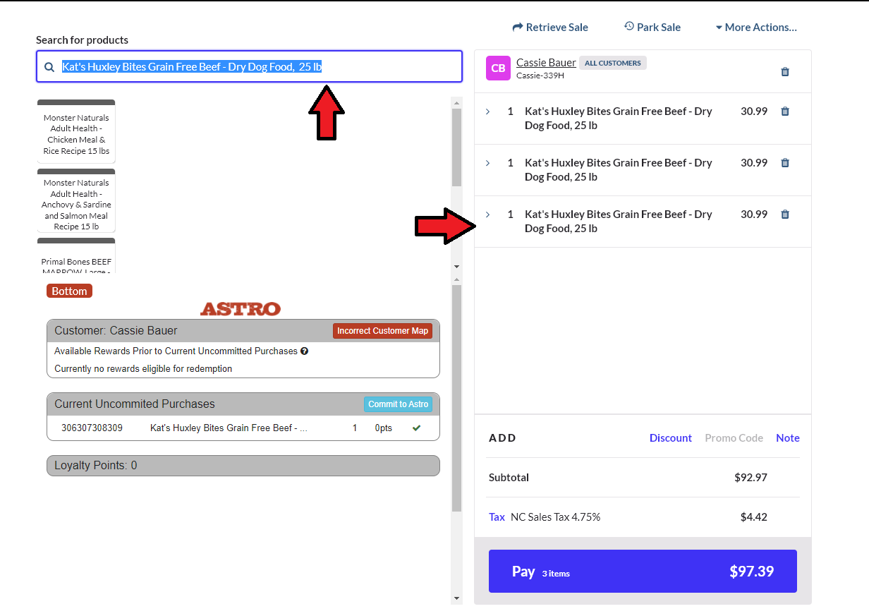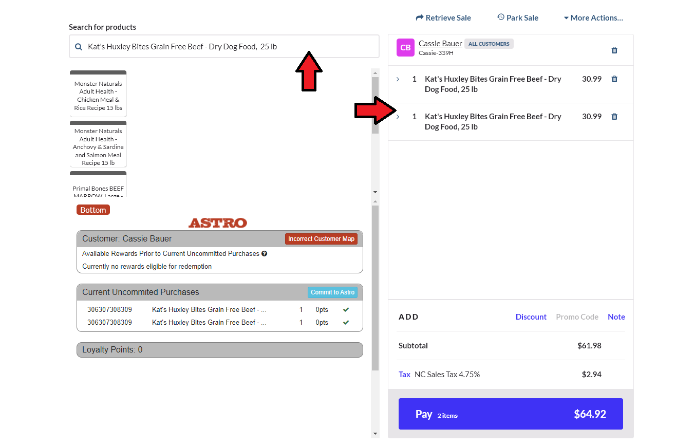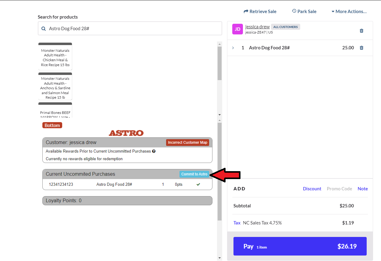 5. Once you have finished ringing up the customer's purchases you can click the light blue button that says "Commit to Astro". This will open up another tab on your browser for Astro and you will find yourself on that customer's Pet Owner account on the first page of an Astro Checkout Screen.