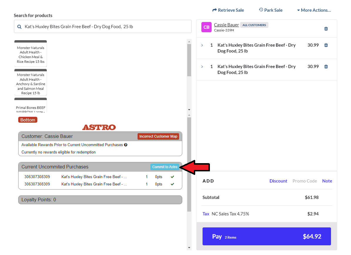 3. Once you have finished ringing up the customer's purchases you can click the light blue button that says "Commit to Astro". This will open up another tab on your browser for Astro and you will find yourself on that customer's Pet Owner account on the first page of an Astro Checkout Screen