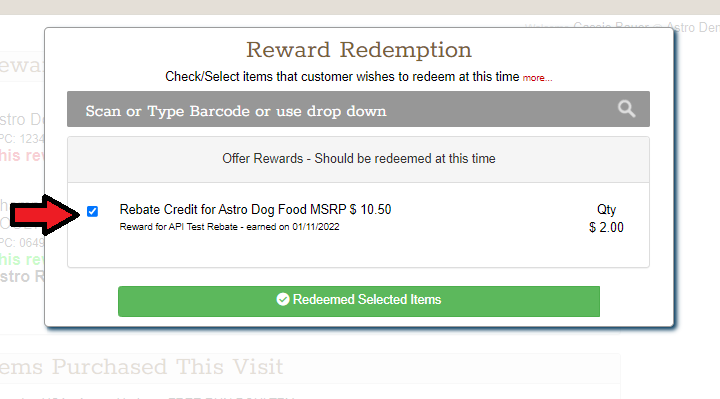 8. You should then see the Reward Redemption pop-up. This will show you the available rebate available to redeem. In this example, we are redeeming a $2 Off rebate.