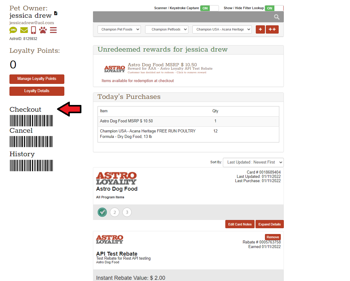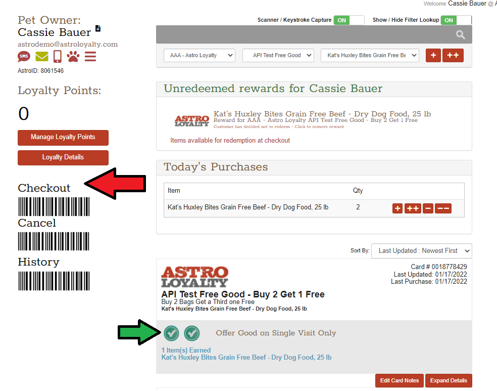 6. You should now see their Astro Loyalty account and a punch card of the items they are buying that qualifies for the Offer. If everything looks correct select Checkout.