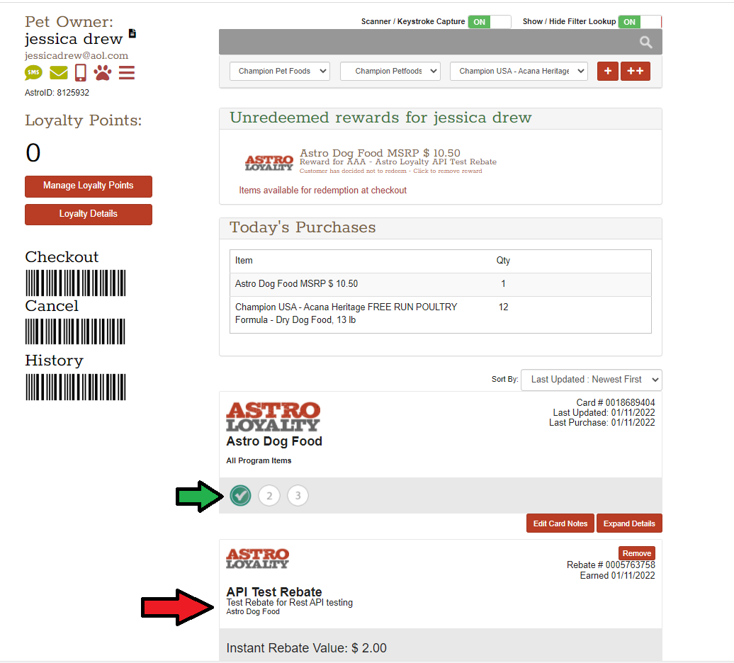 5. You should see a Rebate card on their account now. It will also punch their frequent buyer card if the item is also in a frequent buyer program.