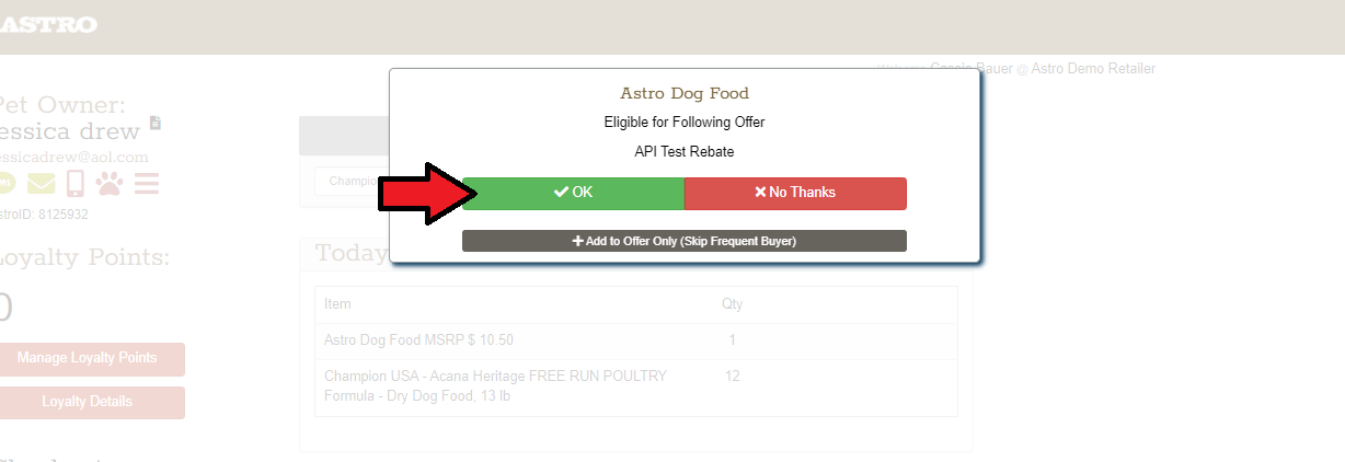 4. You should see a pop-up that the customer is Eligible for an Offer. Select Ok, to apply the offer to their Astro account.