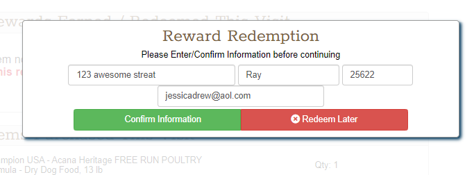7. If the brand whose program you are redeeming requires a Customer Mailing Address or a Customer Email Address you will be prompted to enter this information first, and you must complete it in full in order to reach the Reward Redemption Pop-Up.