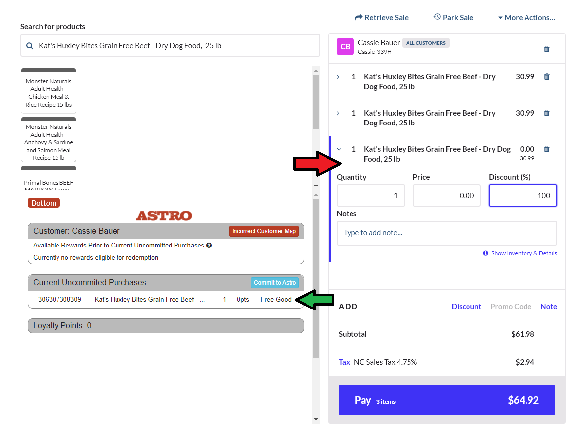 12. Astro does not apply any discounts to your sale. This must be done manually. The method that you choose is up to you when it comes to redeeming on the POS side. You will also notice that the integration is offering you an option to commit the item on the sale to Astro as a purchase. In this case we do not want to do this since the customer is taking this item home for free.