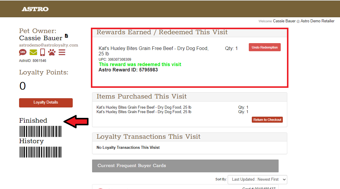 10. You should see the redemption under Rewards Earned/Redeemed this Visit. To save and close out the Astro part select Finished to go back to Vend.