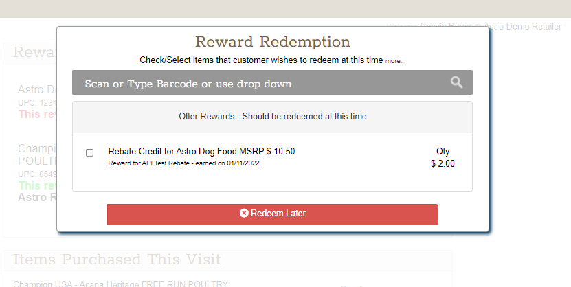 It is NOT recommended to Redeem Later and save the item for next time since these Offers are typically available between the 1st and last day of the month and there is a chance the customer will not make it back to the store in time to redeem it. If the customer returns after the Offer expires there will be no way for them to redeem them.