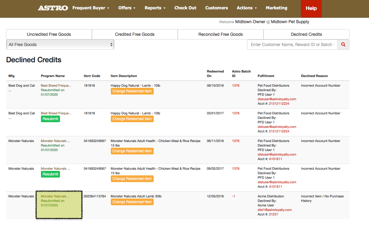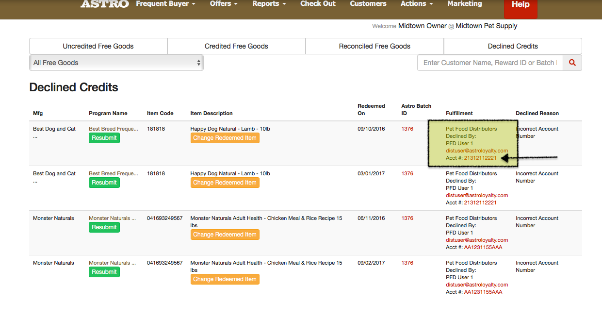 If you had an item denied because it was submitted to the wrong distributor, you can simply click the distributor name located under the fulfillment header and select the correct distributor that your reimbursement should report to. Make sure your account number is also updated. Once you update the distributor information, it will automatically update the redemption to the distributor selected and removed from the declined credit section.