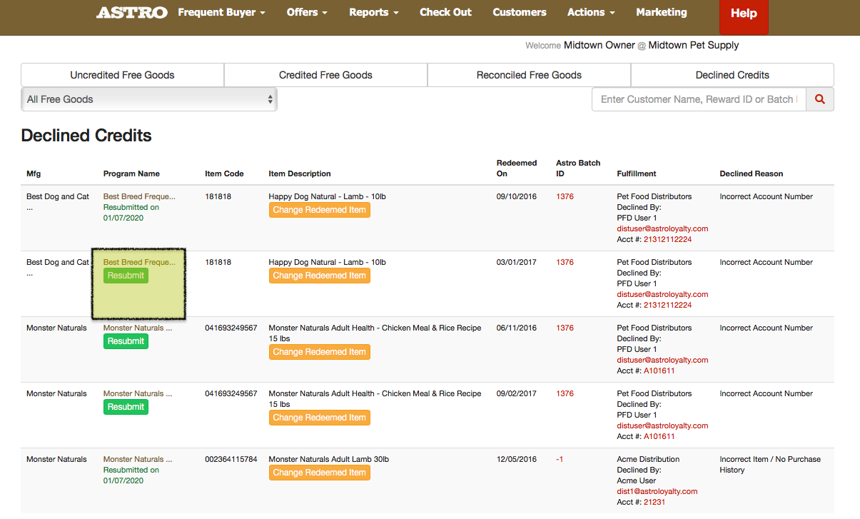 Then click Resubmit Redemption to resubmit the redemption for credit.