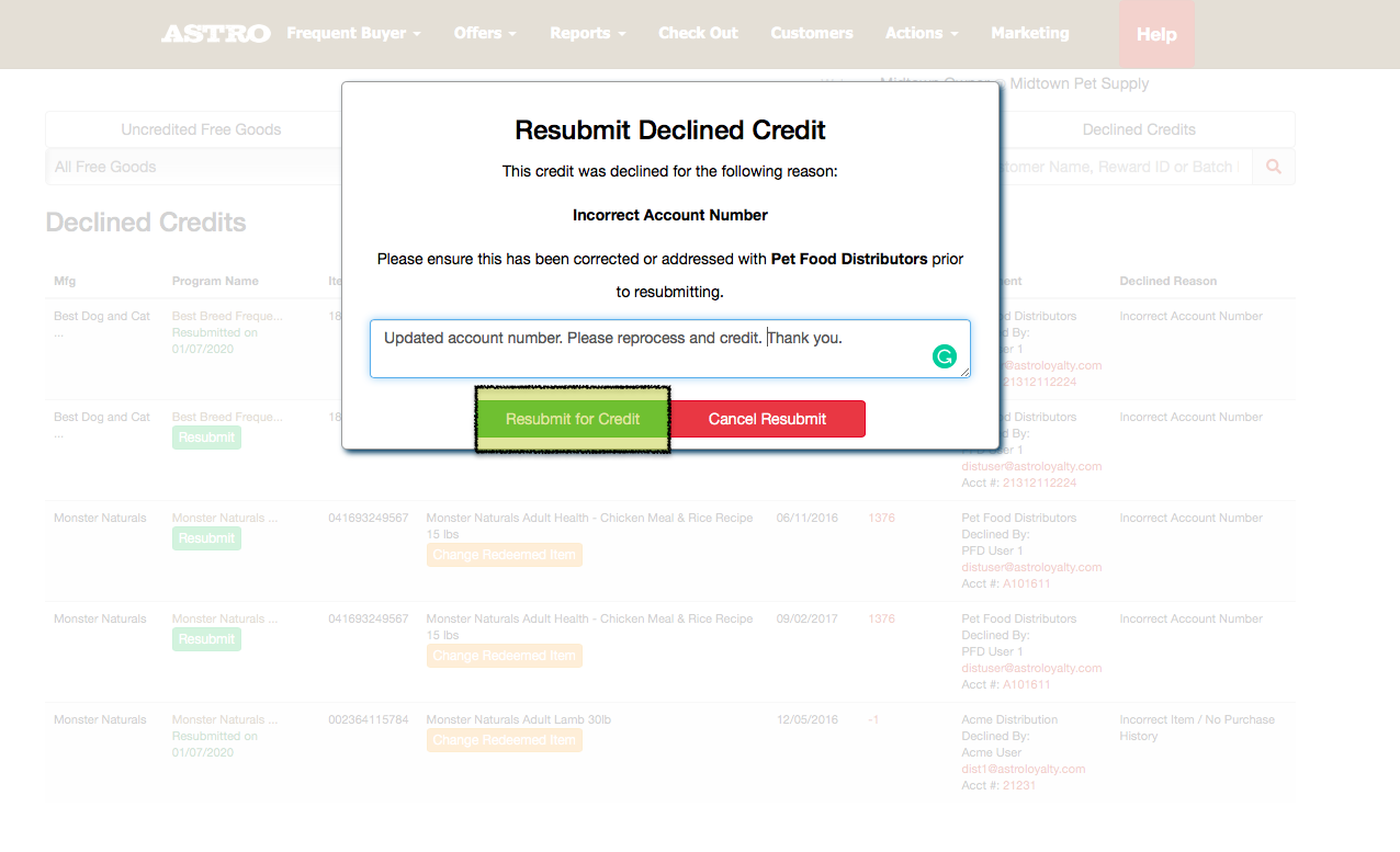 Lastly, select Resubmit for Credit on the pop up. You also have the option to enter a note to distributor.