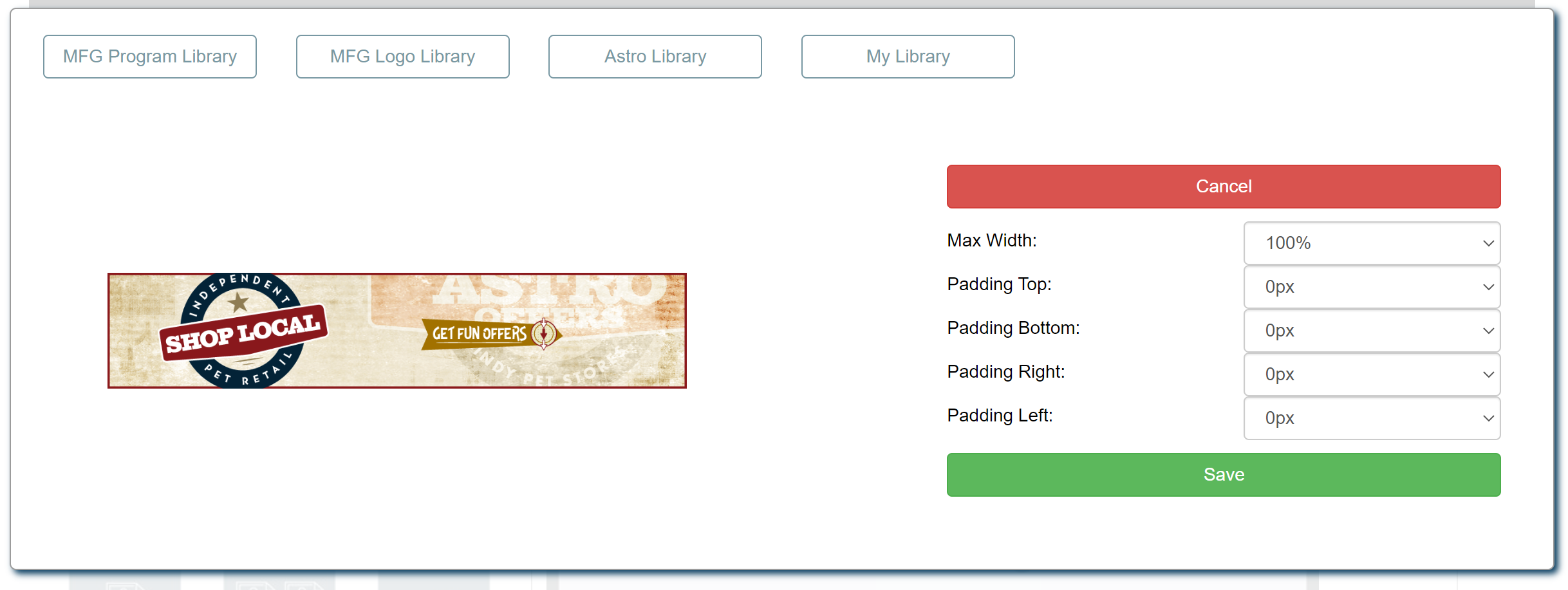Click on one of the images in order to choose it. You will then be taken back to this screen where you can make any size adjustments (100%, 75% 50%, 25%) or apply some padding (white space surrounding the image.) Click Save when you are happy.
