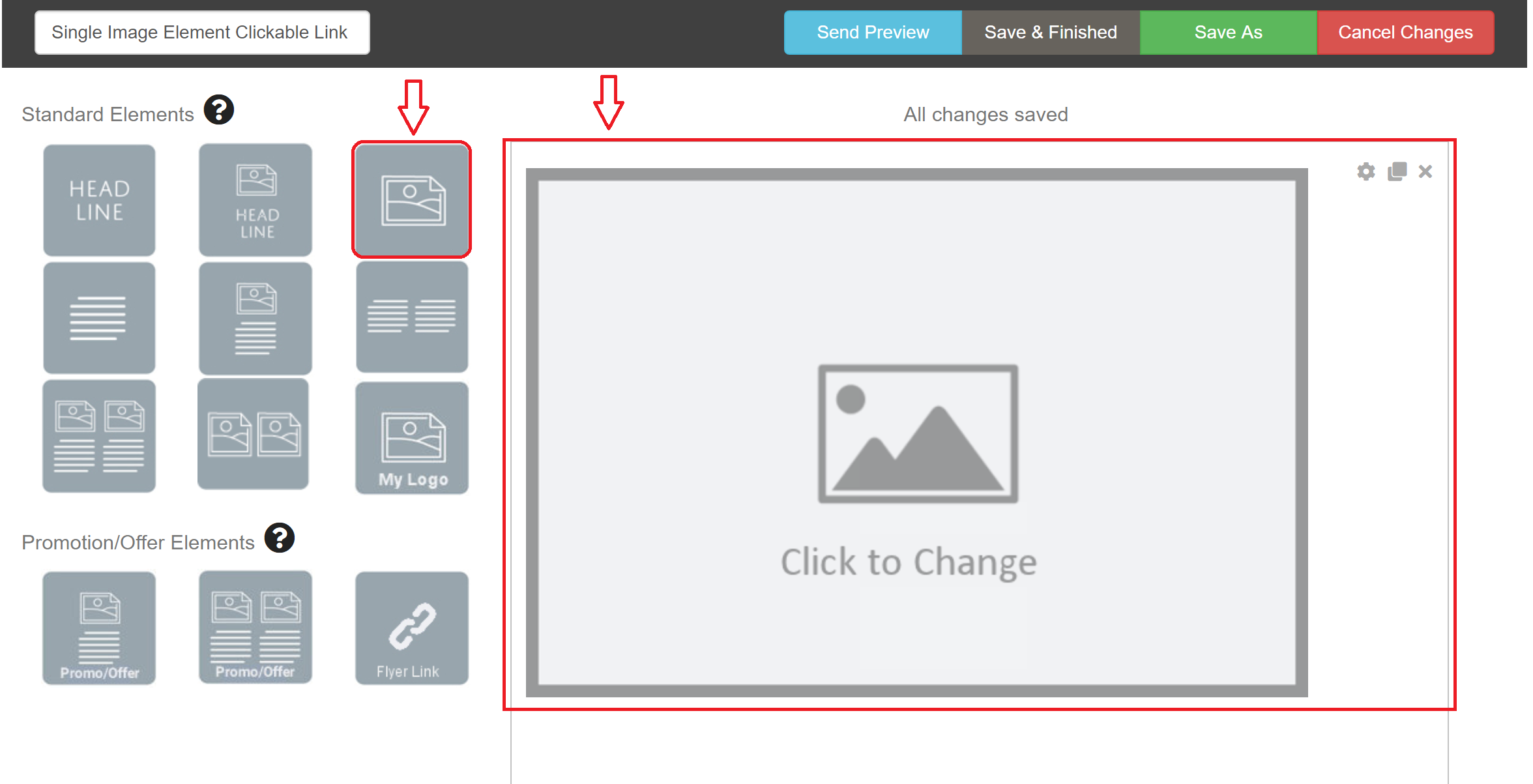 You can add a new Single Image Element to a Template by double clicking on the grey button pertaining to it, or you can click and drag that button onto your template.