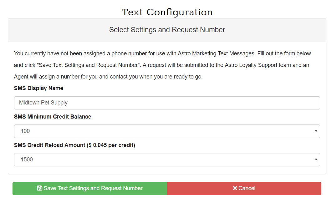 In order for you to communicate with your customers via text you need an SMS phone number. To register for one you must fill out the form contained within Text Configuration and submit it to Astro Support.