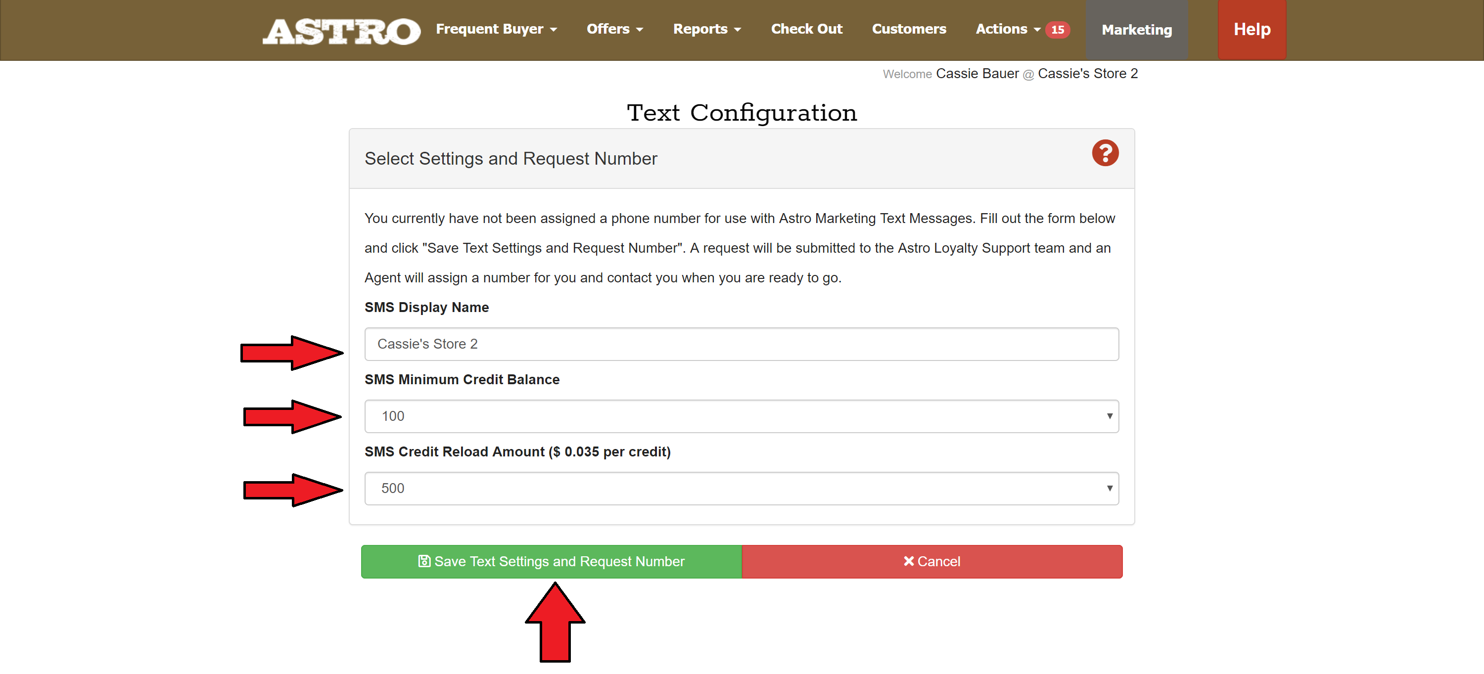 4. This will take you to the Text Configuration page. Here you can add your store name to the SMS Display Name box and this name will appear in the SMS From box when creating text messages. You will see the SMS Minimum Credit Balance with different options to select from in the drop down menu. This amount represents the minimum amount of credits before automatically reloading to the maximum credits. SMS Credit Reload Amount is the maximum number of credits you would like to have regularly. Once you are below your minimum credit balance amount it will automatically purchase credits to the selected reload amount.