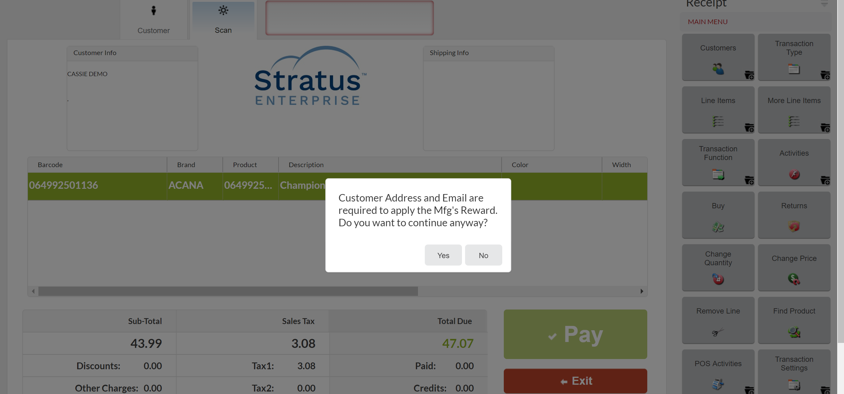 Selon le programme d'acheteurs fréquent dans lequel vous êtes inscrit sur Astro, certaines marques nécessitent l'adresse e-mail du client et/ou une adresse personnelle. Si le client ne dispose pas déjà de ces informations dans Astro, vous verrez cette fenêtre contextuelle vous permettant de recueillir des informations supplémentaires avant que le client puisse échanger son article.