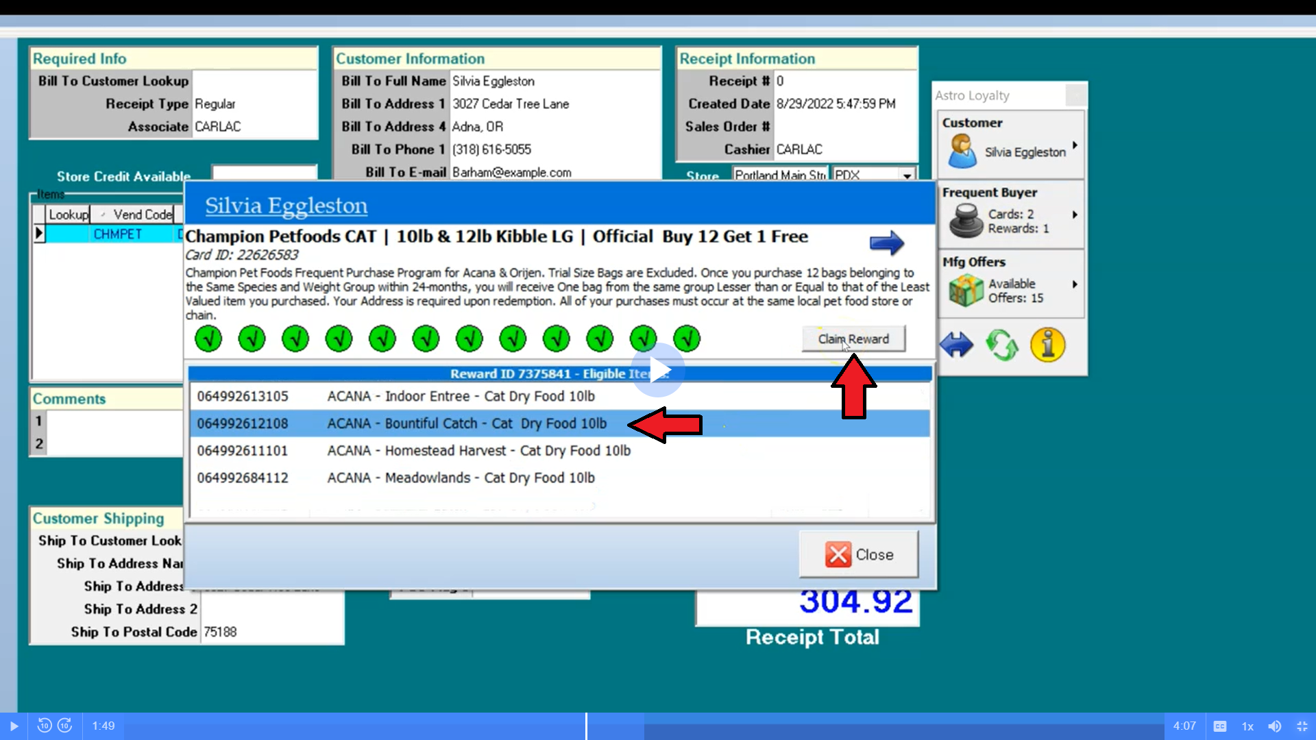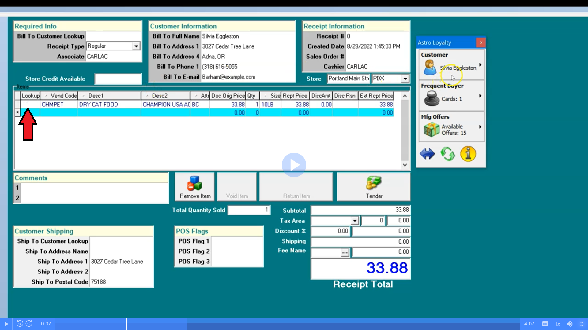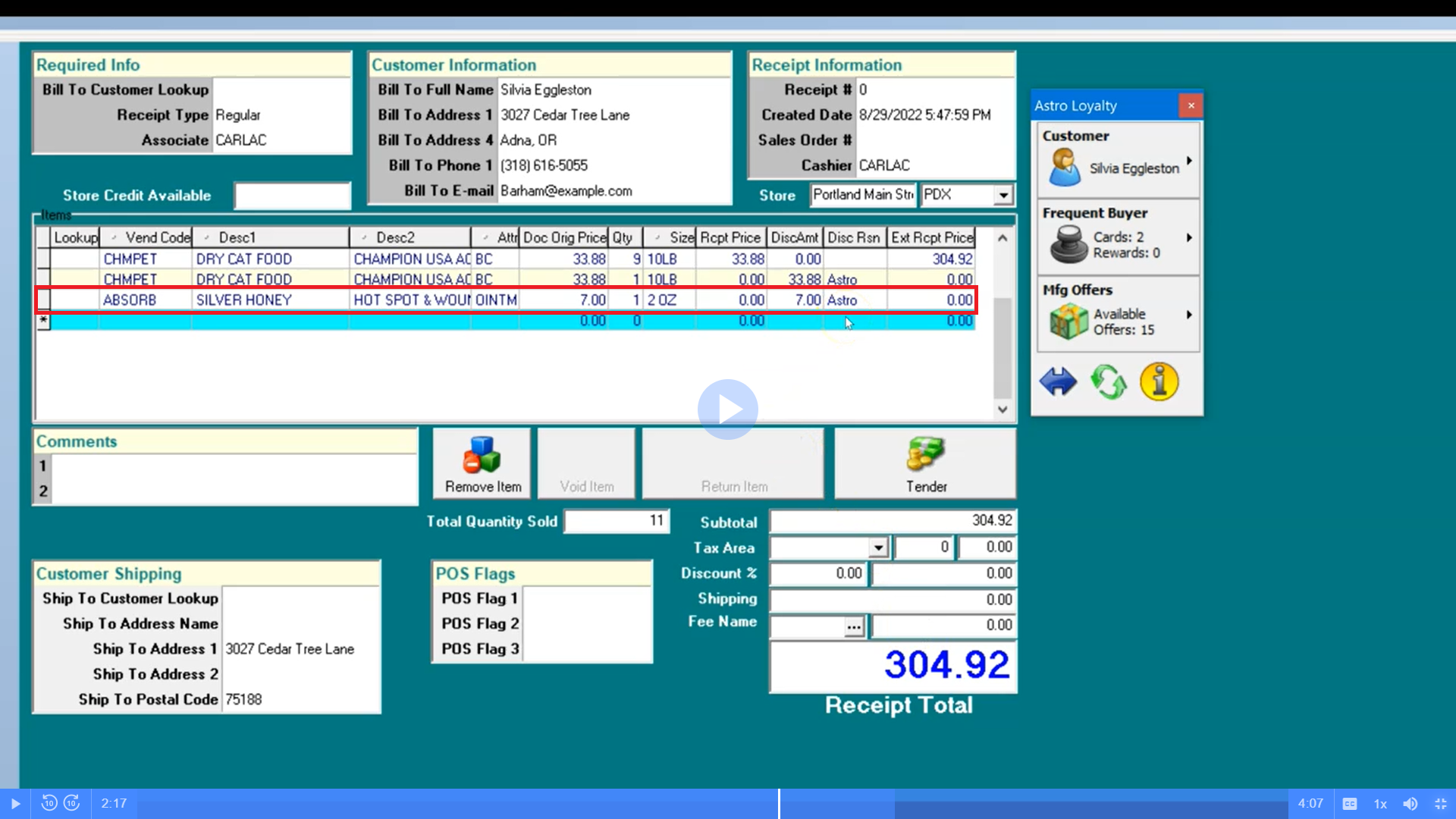 3. Cela ajoute l'article à la vente et le rabais spécial Astro qui a été mis en place dans les étapes Configuration sera appliquée à la vente. Cet article a été revendiqué.