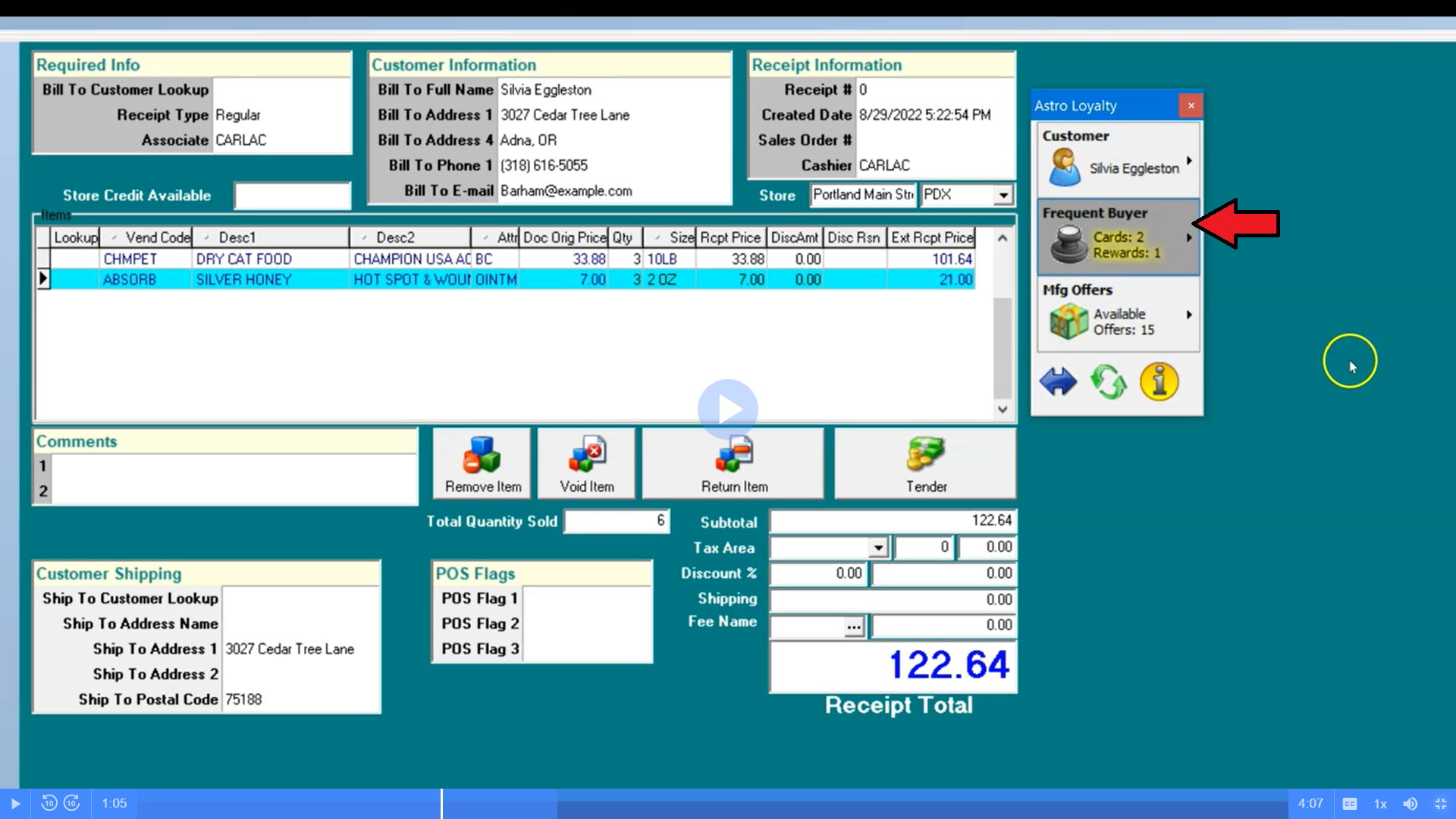 3. Ajoutez les achats à la vente. Si l'UPC correspond à ce qui est répertorié dans le programme Frequent Buyer, il frappera automatiquement la carte client.