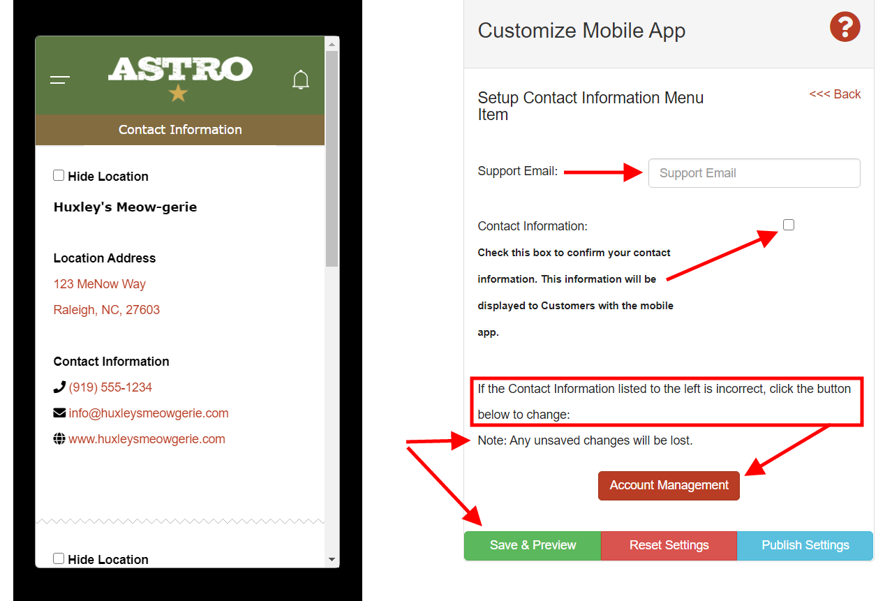 Sur la gauche, vous verrez les informations que vos clients verront. Si ces informations sont correctes cochez la case à côté des Informations de contact sous Email Support.