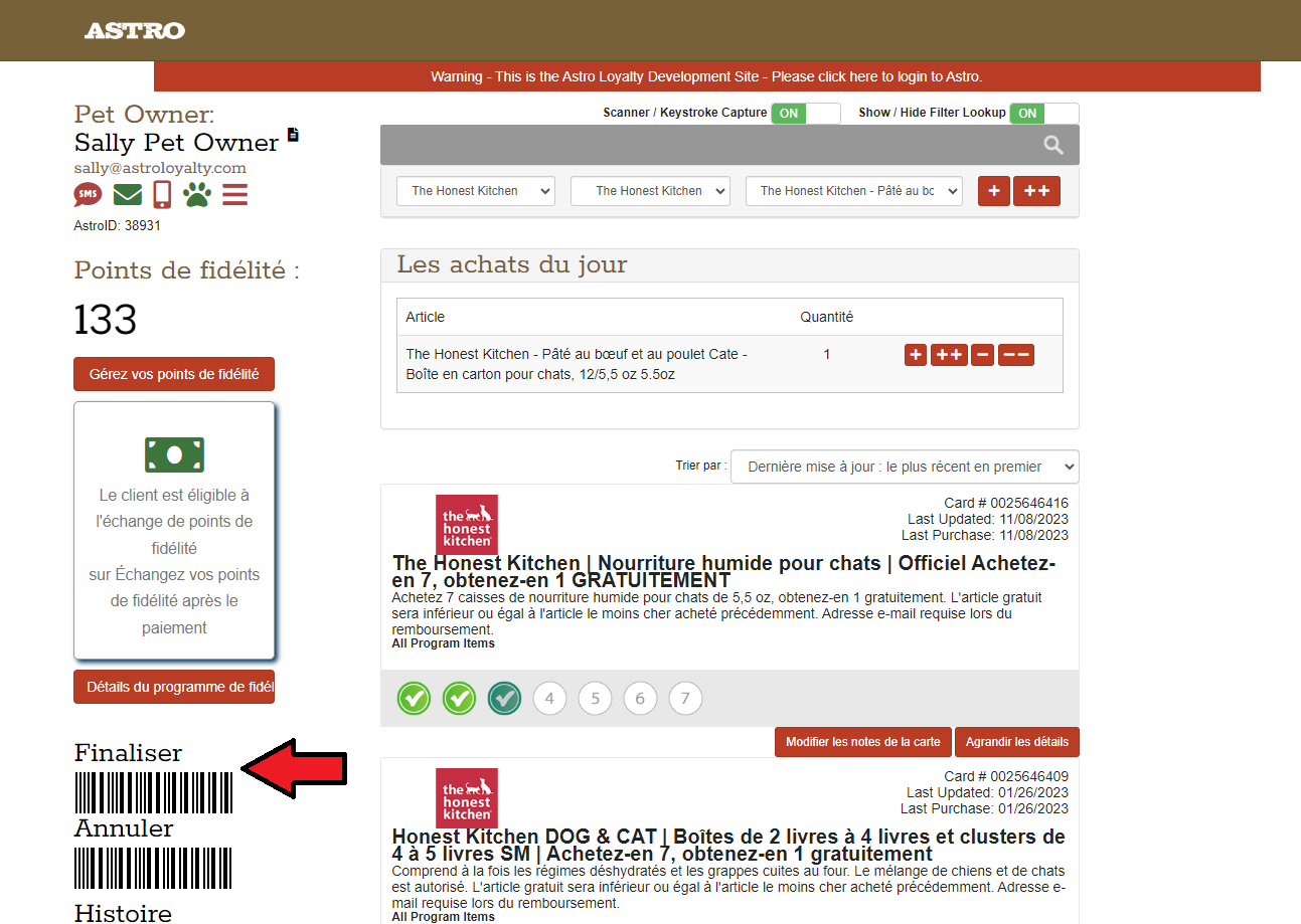 4. Une fois que vous avez ajouté les achats, il apparaîtra sous Achats d'aujourd'hui et comme une coche sur une carte numérique.Après que tous les éléments ont été saisis dans Astro, cliquez Paiement, Situé à gauche de votre écran sous le nom et les informations du client.