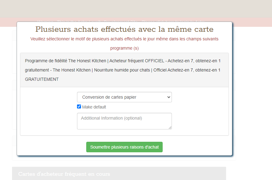 Si vous ajoutez plus d'un article à une carte d'acheteur fréquente, vous déclenchez la pop-up Multi-Item. Cette fenêtre contextuelle vous permet de sélectionner rapidement la raison d'ajouter plusieurs éléments lors d'une transaction à partir d'un menu déroulant. Cette raison est communiquée à votre distributeur et à votre fabricant, assurant ainsi le traitement de vos crédits.