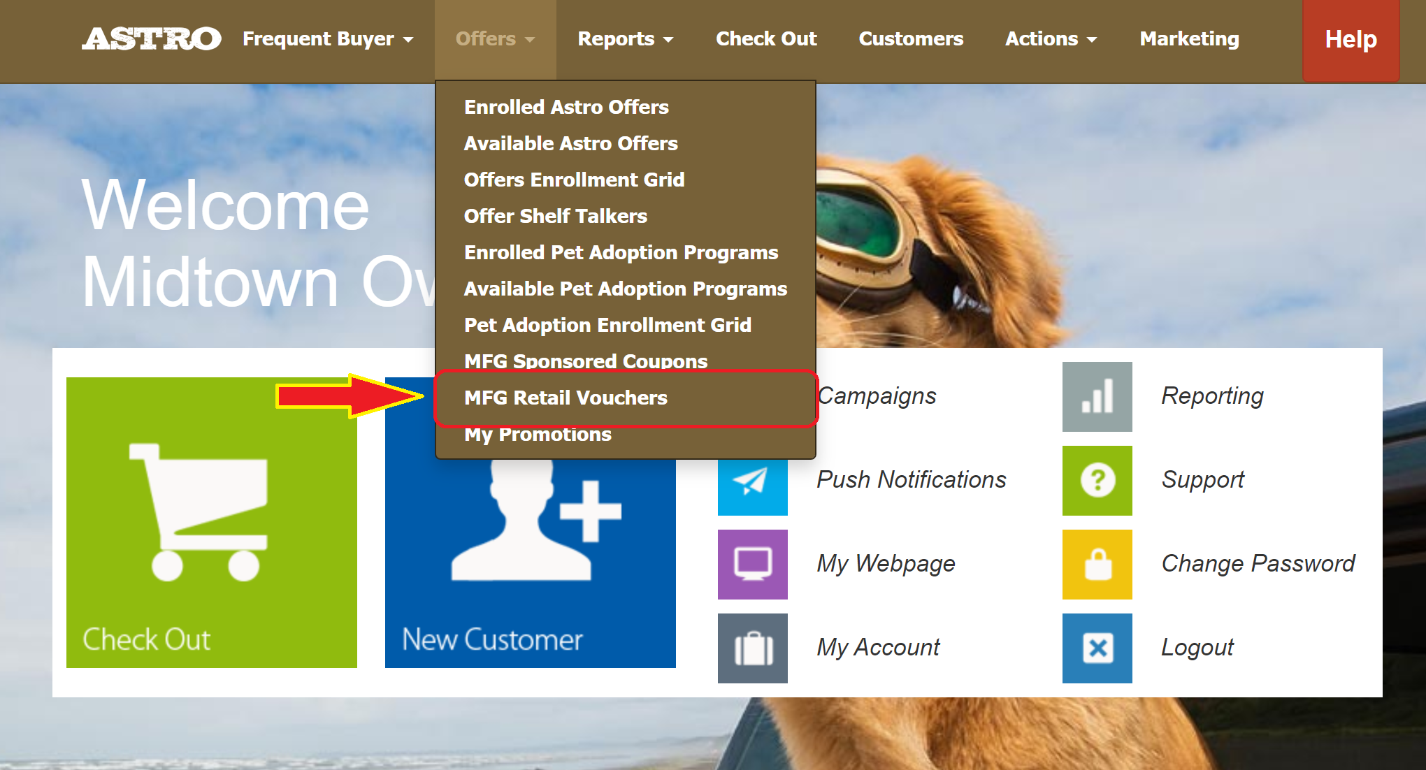 1. Commencez par vous connecter à votre compte Astro en tant que Admin Utilisateur. Maintenant, allez à votre Offres spéciales menu et sélectionner Mfg.